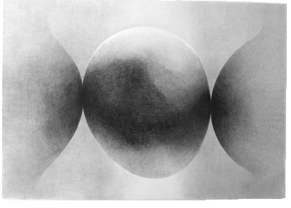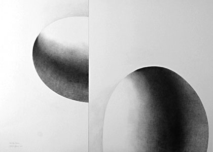 Herhaling en ritme, lijn en toon, hard contrast tussen zwart en wit en zachte toonvariaties spelen een belangrijke rol. Die ambivalentie die ik van bij het begin opmerkte, zit er wel degelijk in. De belangrijkste uitdaging voor haar ligt in de zoektocht naar balans tussen figuratie en abstractie. Dat doet ze op twee manieren. Bij de eerste gaat ze uit van een object dat voor haar een ā al dan niet dubbelzinnige - betekenis heeft, bijvoorbeeld een kiezel of een spijker. Daarvan maakt ze fotoās of een tekening die op het eerste gezicht heel naturalistisch lijken.