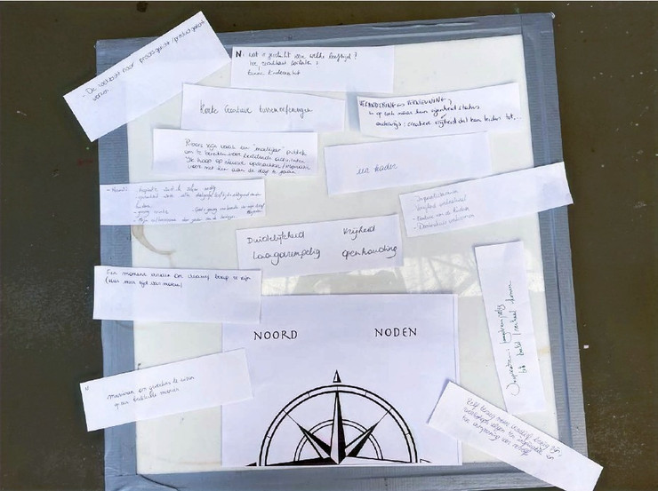 Om tot ideeĆ«n te komen om met kinderen en jongeren creatief aan de slag te gaan, werkten we bij de volgende oefening met een āKompasā. Bij elke windrichting van het kompas, konden we onze gedachten kwijt. Bij ānoordā noteerden we onze noden, bij āoostā onze motivatie en bij āwestā onze uitdagingen wat betreft het beeldend werken met kinders en tieners.